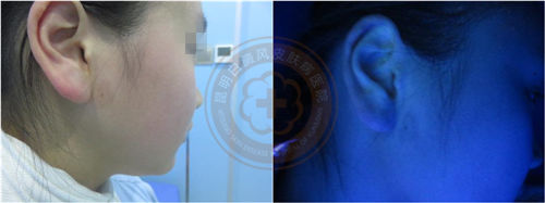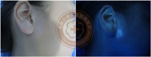 ▲wood灯:右侧耳前等白斑色素减退40-100%