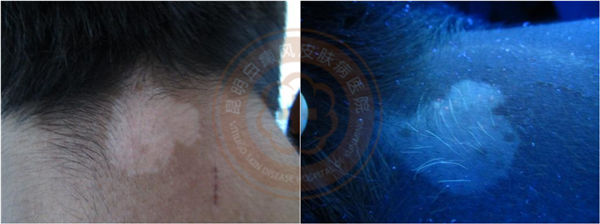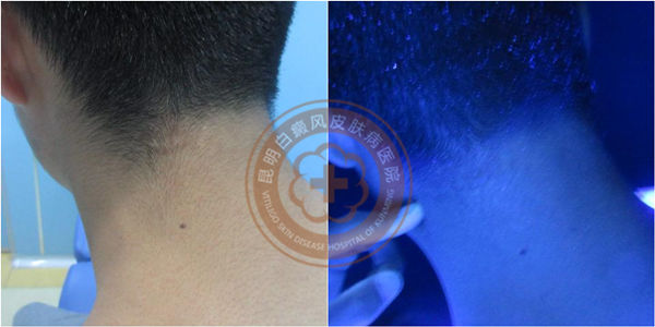 初诊时,在智能AI成像检测系统下,看清楚的看到患者后颈部白斑色素脱失严重,边缘边缘清晰可见,白斑处于稳定期