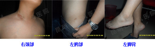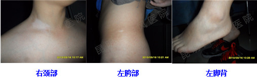 (针对患者病情,医生采用中西医结合治疗治疗了一段时间后,隐形白斑消失,颈部白斑缩小,左胯部及左脚背白斑基本色素加深,疗效显著)