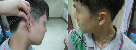 (初诊时,患者两侧耳廓及双眼眼周白斑明显,色素脱失严重,边缘模糊,白斑处于进展期)