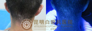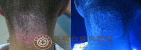 4、Wood灯:灯下后颈部出现片状白斑,边缘模糊不清,色素脱失严重。