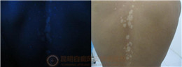 检 查:1、伍德灯:患者背部白斑色素脱失严重,边缘清晰
