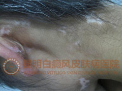 ▲病史:患者章蓉在两年前发现颈部、左耳后白斑,曾到当地医院就医,口服过多种药物(药名不详)外涂外擦药(药名不详)白斑慢慢扩大延伸至前鬓角,今来我院就诊。