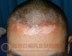 ▲病 史:患者于3年前发现头皮至额头部出现白斑,过去曾在当地用外用药治疗