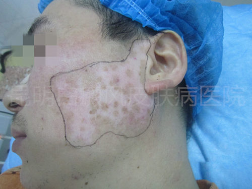 初诊时,患者右面部白斑色素脱失严重,边缘边缘清晰可见,白斑处于稳定期