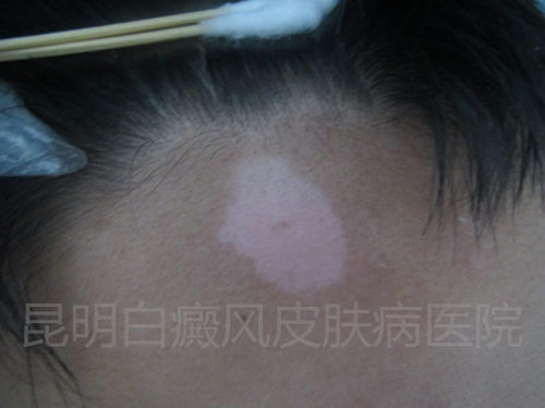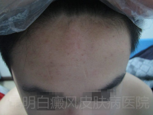 【患者来我院治疗时,额头白斑照片,黑色素脱失严重】
