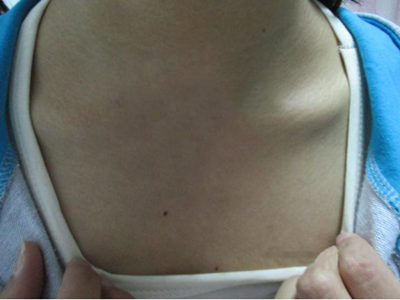患者小莉是一名大学学生,学习压力很大,经常熬夜,两年前,小莉发现自己胸部出现一小块白斑,然后去当地医院检查,医生就开了点外用药让她回去涂抹。使用一段时间后,病情无好转,后来还去其他医院医治过,使用过注射药物,效果不佳,由于学业繁忙,就没再进行过治疗。后来白斑逐渐扩大,也越来越明显。