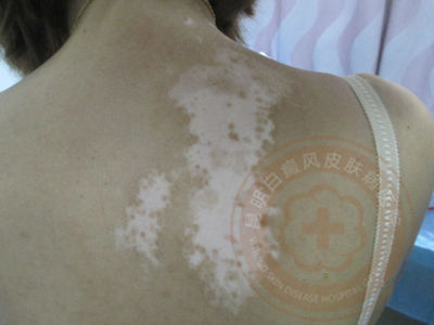 ▲病 史:患者习惯性晚上11点以后睡觉,饮食喜欢酸辣、水果、饮料,出门不防晒,患者于4年前无明显诱因背部等处出现白斑,白斑逐渐增多扩散,曾在其他医院看过(用过口服药和外用药),效果不佳,今来我院就诊。
