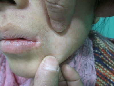 患者6月前无明显诱因发现左侧口角出现白斑,颜色较浅,曾在综合皮肤病医院就诊,给予多种外用药涂抹,最近停药十多天,效果不佳,今来我院就诊。
