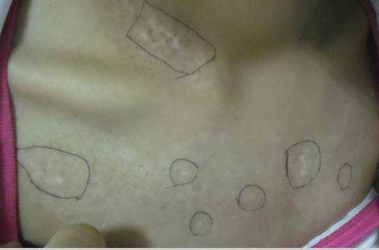 病情描述及疑问:女孩身上白斑初期症状图?我家小孩不久前发现胸前长出一点点白色斑点请问是什么,没什么感觉,不大,不仔细看不清楚,是不是白癜风?需要治疗吗?