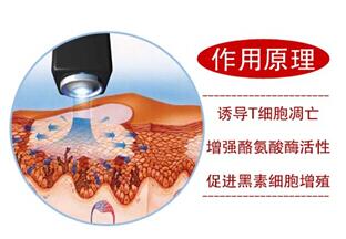 临床研究表明:308nm波长是诱导白癜风皮损中病理性的T淋巴细胞凋亡的适宜波长,也是UVB波段内穿透力较强的波长,最深可穿透真皮浅层1.5mm,因此对治疗白癜风有良好的效果。医疗上就是利用这个原理,通过激光直接照射皮损处,使之引起相关的生物和化学变化,从而促进皮肤色素的合成,达到治疗的目的。