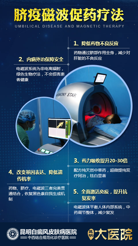 药物、脐疗、电磁波三者完美的贯通结合,避开了中医单疗程疗效弱的缺点,使黑色素、角朊细胞得到全面激活、再生,恢复了黑色素的自我生成机制,从而改变基因表达,降低了白癜风的遗传机率。