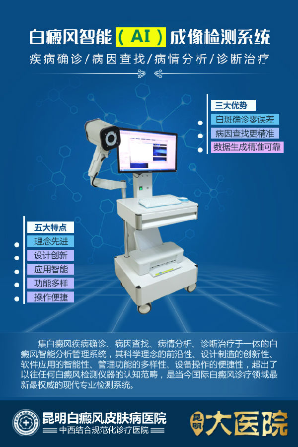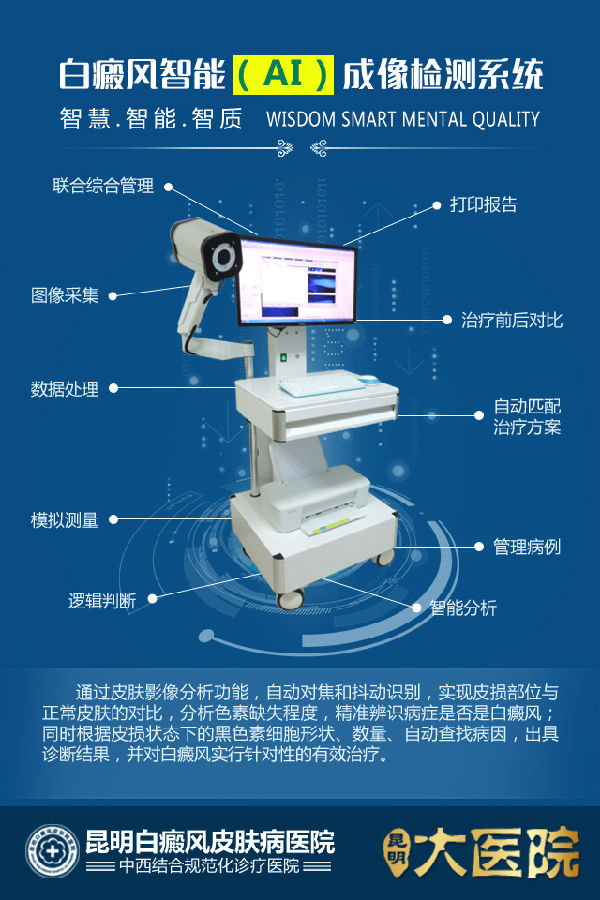 目前全球仅有极少数专业机构拥有白癜风智能(AI)成像检测系统,例如美国华盛顿大学医学院、荷兰医学科学院、澳大利亚皇家珀斯医院、昆明白癜风皮肤病医院
