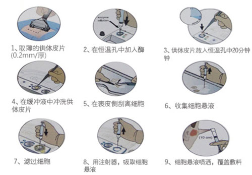 3、采用国际领先的融合细胞“上喷”技术,1*1平方厘米供体皮片获得的上皮细胞悬液可覆盖80平方厘米创面。供体皮肤组织仅需要提供2cm*2cm,可实现大面积320平方厘米的白癜风治疗;