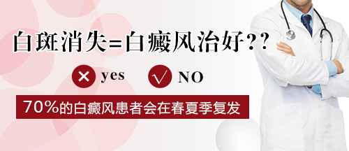 在临床中,医生通知患者:白斑已经消退,肤色已恢复正常,现在可以出院了,但以后还需来院进行抗复发治疗。但是此时的大部分患者认为看不见白斑就万事大吉,白斑消失后,就认为已经达到他想要治疗效果,不需要进行二次治疗,肉眼成为评判白癜风康复的标准,不遵循医嘱,也不愿来院接受巩固或抗复发治疗,这是目前绝大部分白斑患者的治疗现状。