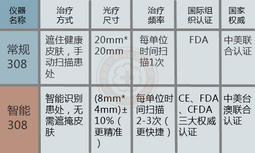 智能308与传统308大有不同,消除以往白癜风治疗定位不准确、手动控制有误差的弊端;结合影像识别技术与自动化微光斑扫描系统。智能定位病患区域,自主分配剂量,快速精确扫描;全程智能控制治疗过程,以高效率、零误差完成治疗。无论大小面积白斑,还是四处分散白斑,都可快速精准治疗。