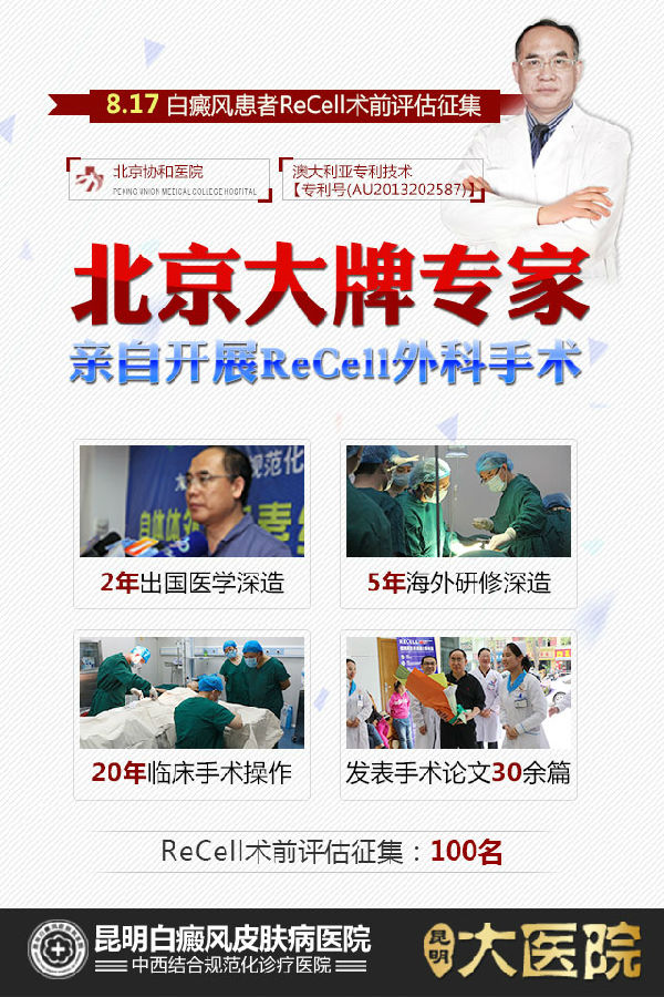 8月17日,北京协和刘志飞教授第三次昆明,为已预约的白癜风患者亲自操刀手术。现特向云南省征集ReCell术前评估患者100名,先评估,后手术,让更多患者享有北京医生亲诊和康复的机会。