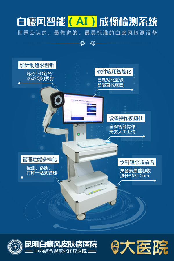 为了帮助广大患者,找出隐藏在皮肤中的“白斑”, 最全面的病因,接受最规范系统的诊疗,早日摆脱白魔困扰,昆明白癜风医院积极探索白癜风检查治疗的机理,积极引进更高级、更先进的白癜风检测设备—白癜风智能AI成像检测系统,来帮助广大白癜风患者早日走出“白色”阴影。