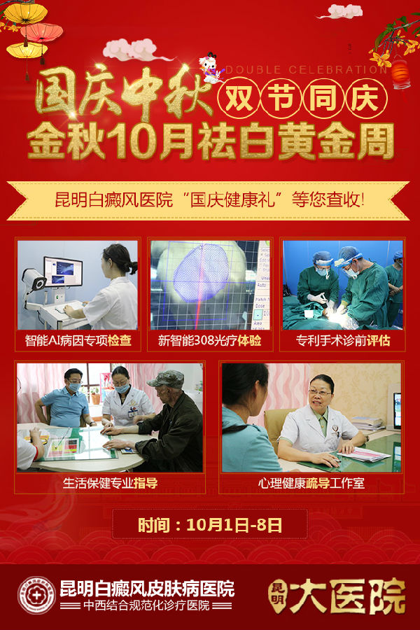 然而,却有那么一部分人群,因为身上的白斑,少了节假日的欢笑而倍显落寞。为此,在国庆节到来之际,为了让更多白癜风患者尽早“健康过佳节”,昆明白癜风皮肤病医院联合多部门,发起《国庆中秋双节同庆·金秋10月祛白黄金周》,为国庆前来就诊的患者、进行“智能AI病因专项检查、新智能308光疗体验、专利手术诊前评估、生活保健专业指导、心理健康疏导工作室”等诊疗服务,帮助更多白癜风患者早日实现祛白梦。