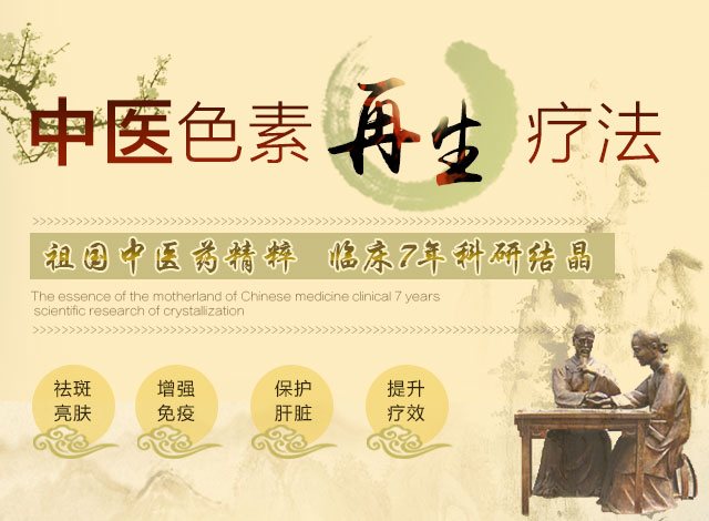"中医色素再生疗法"是一种依据"治其外必治其内"的中医特色治疗手段,从"人参、黄芪、白术、甘草..."等 上千种天然中药,提炼出激活人体酪氨酸酶活性和黑素细胞的药物配方,利用高科技设备"中医熏蒸、中医药浴、磁波塌渍、等,使药物药效吸收更好,见效快,疗程短等作用。